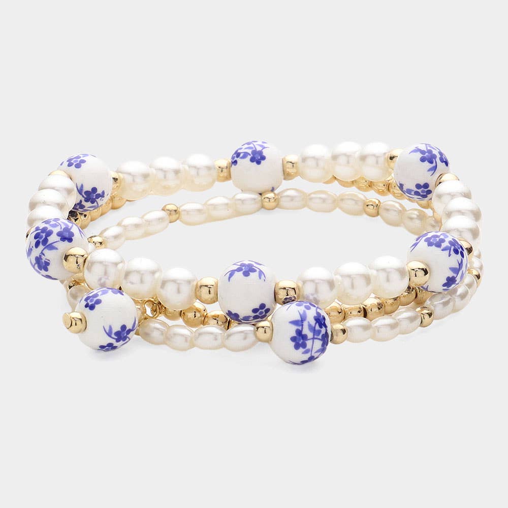 3PCS BLUE FLORAL PEARL BEADED STRETCH BRACELET