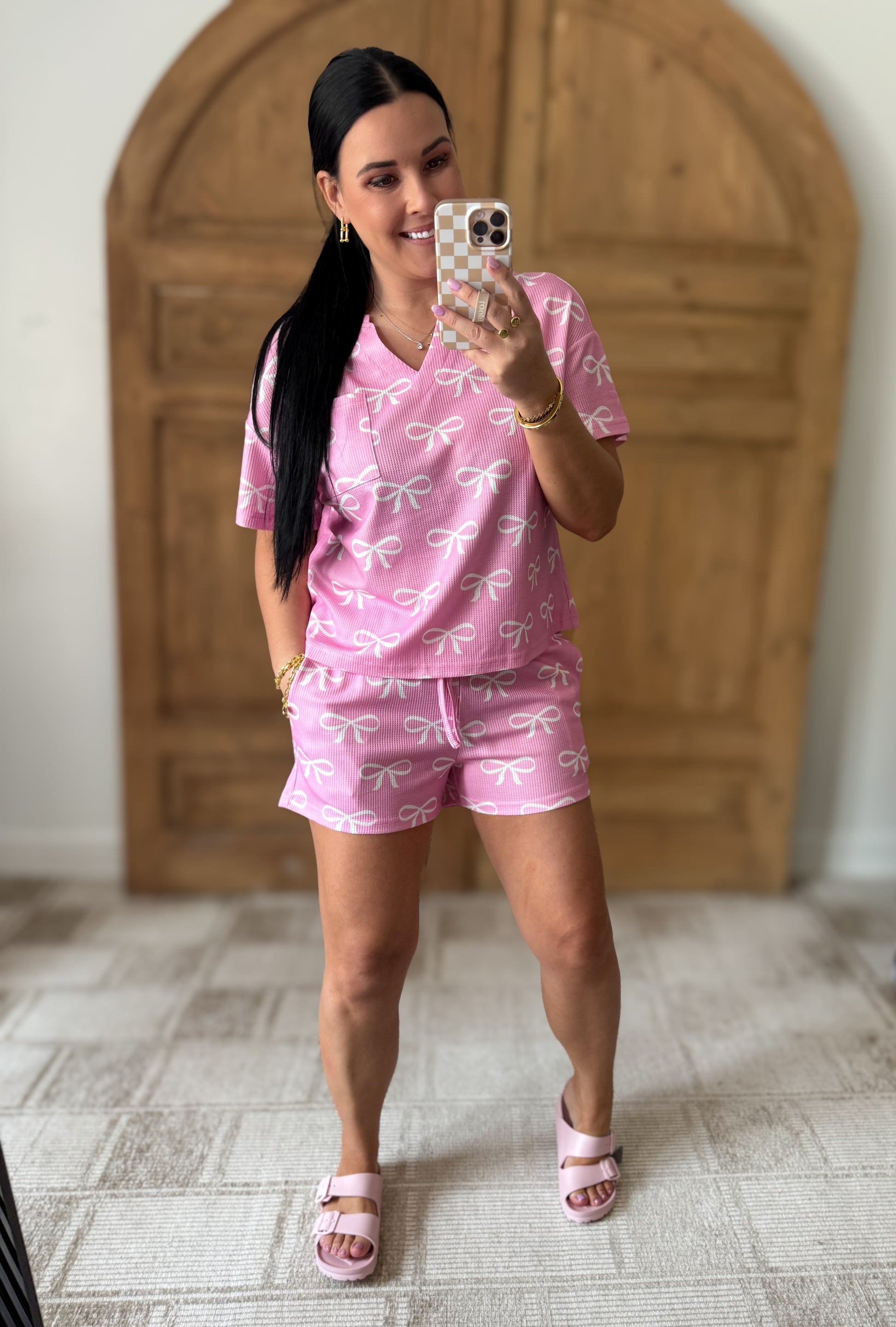 - Unleash your inner charm with our Bowknot Printed Notched T-Shirt and Shorts Set. This soft and true-to-size waffle lounge set is perfect for your spring and summer adventures, whether you're traveling or just lounging at home. Comfort meets cuteness in this must-have set.