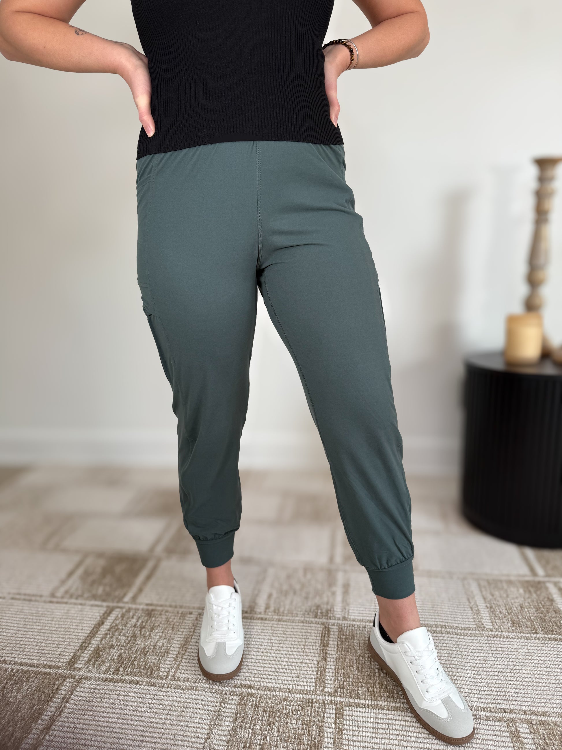 Your new go-to pants. Exceptionally flexible. Can be worn for whatever you do- whether you're at work or hitting the gym. These joggers will quickly become your favorite. The Smoked Spruce Cargo Joggers offer the perfect balance of comfort and style. Made from super soft fabric, these joggers come with a waist band for a secure fit, side pockets for convenience, and cargo pockets with trendy pintuck detailing. The bottom band gives a modern twist to the design. The high waisted style will keep feeling confident and comfortable all day.