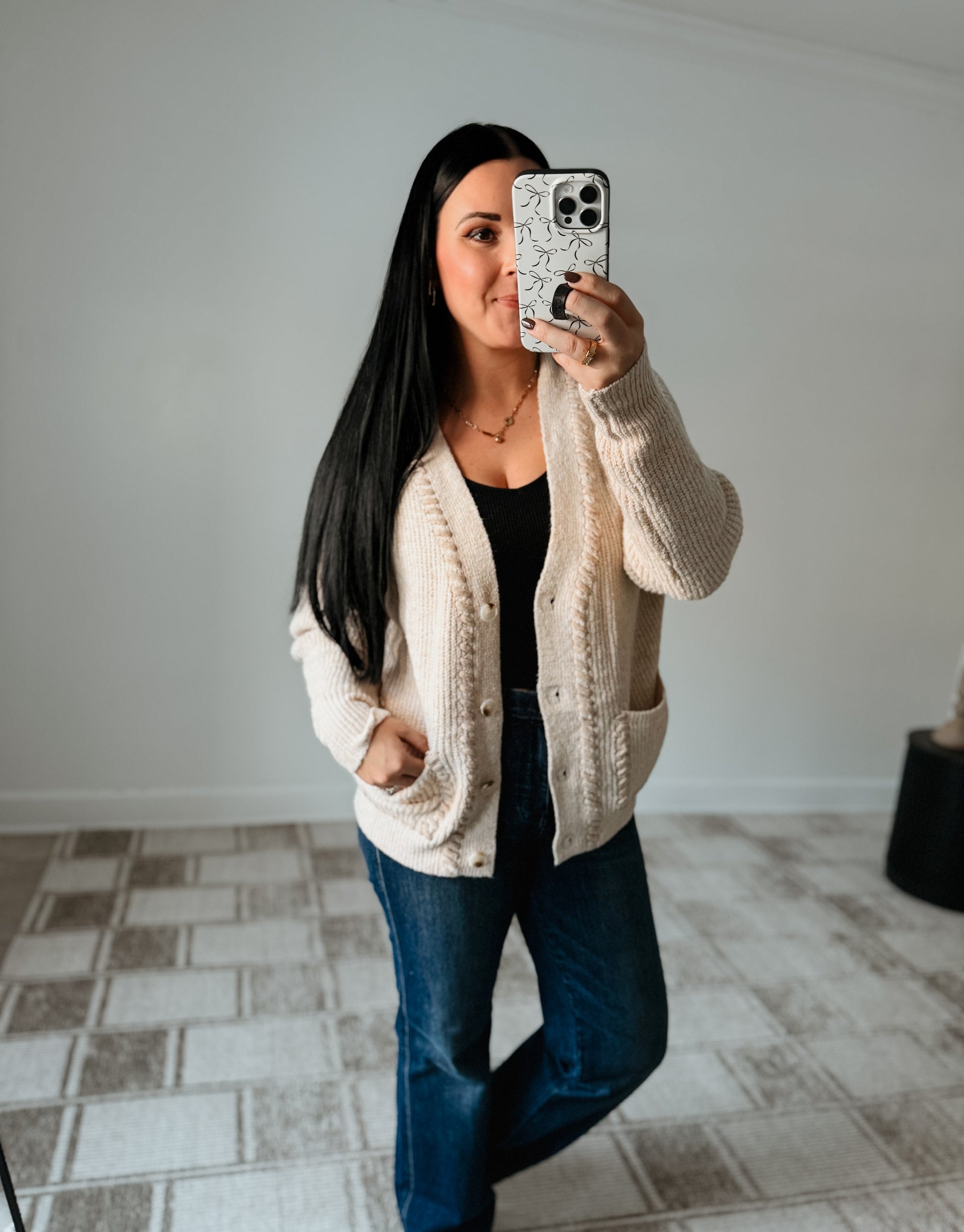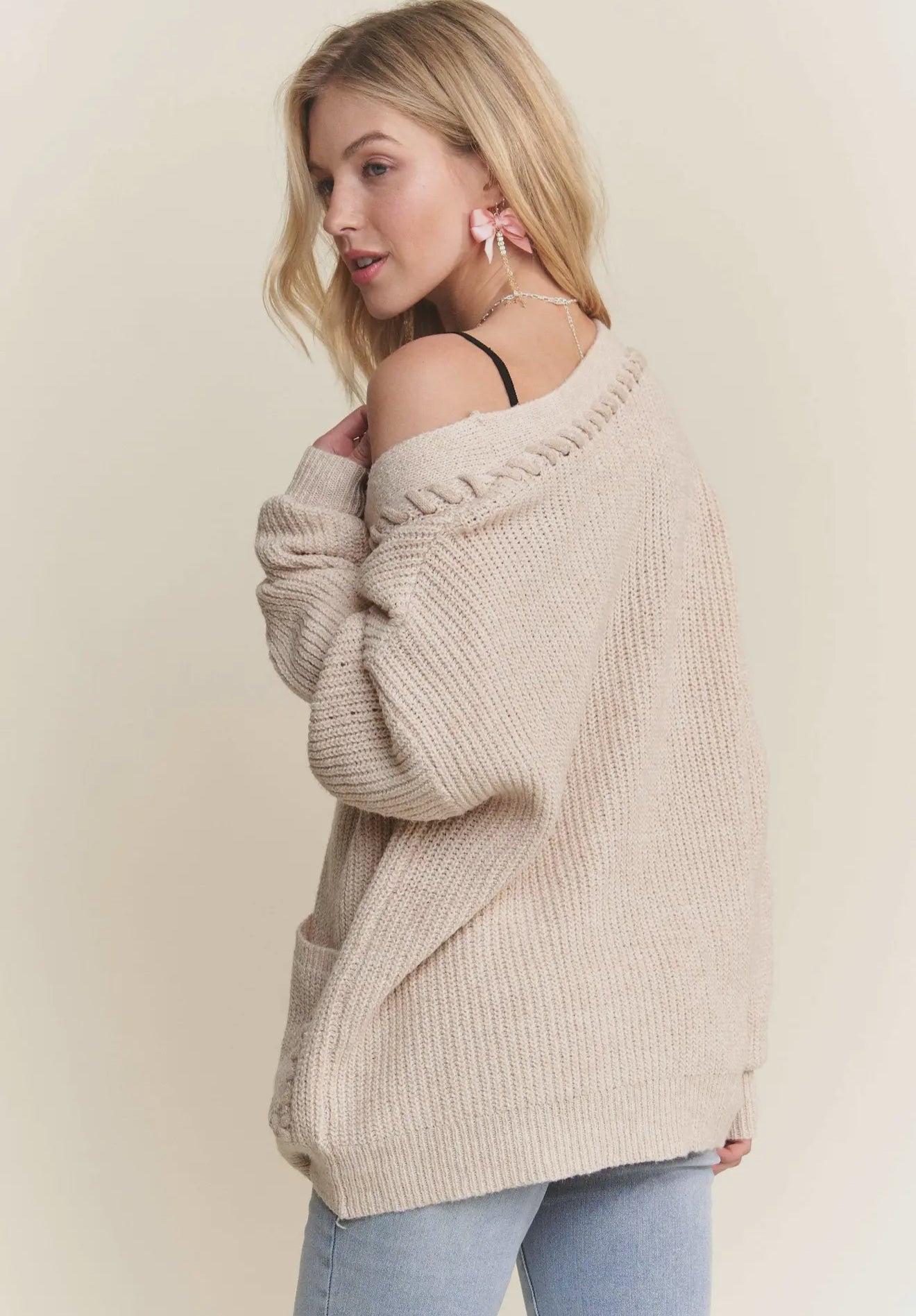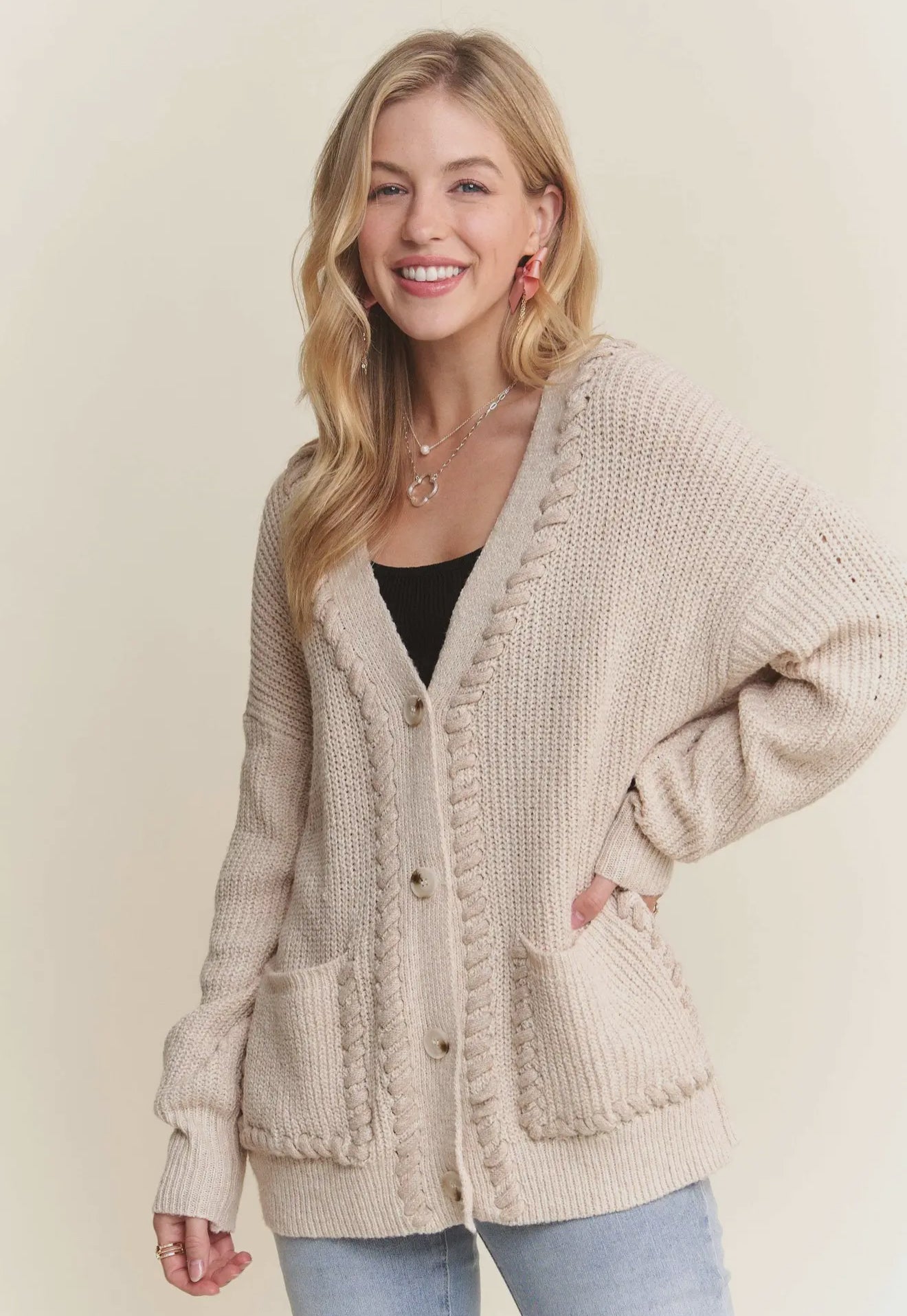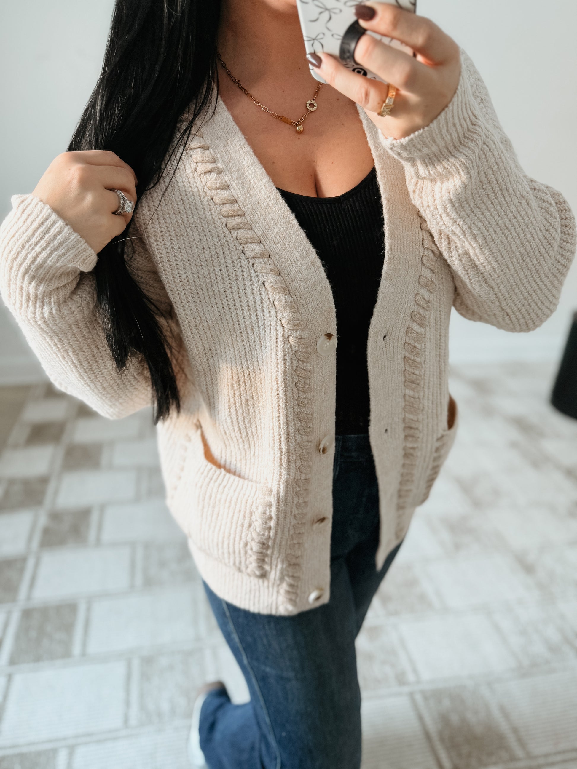 This Long Sleeve Button-Down Sweater Cardigan with Stitch Accents is the perfect combination of comfort and style. Made from 100% polyester, it features a relaxed drop shoulder design and a classic button-down front for easy layering. The side pockets add practicality, while the stitch accents provide a touch of texture and detail.