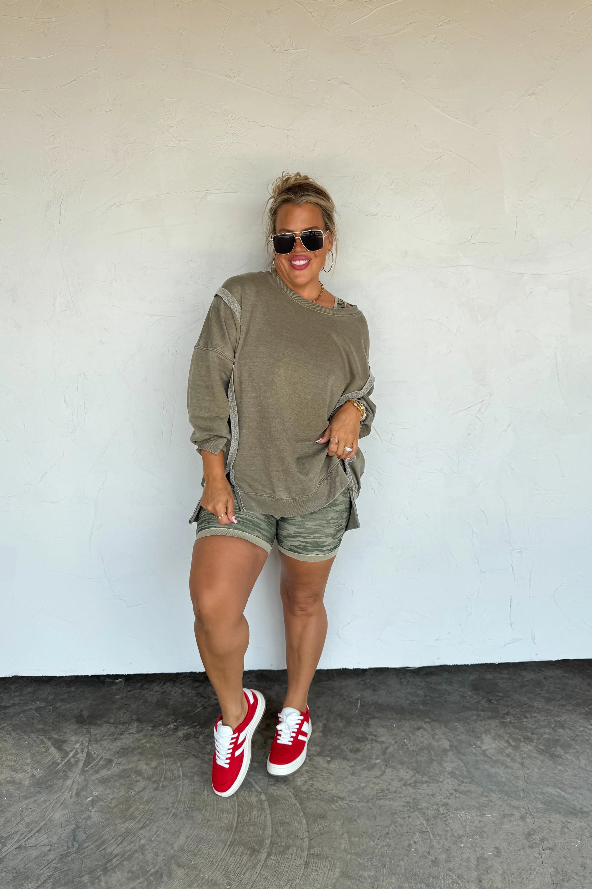 No attention was spared on the details in this new mineral washed sweatshirt! This forever timeless pullover is a slouchy, relaxed fit with exposed seaming, cute split cuff hem and ribbed trim detail! Has super soft "sweatshirt" feel on the inside!
