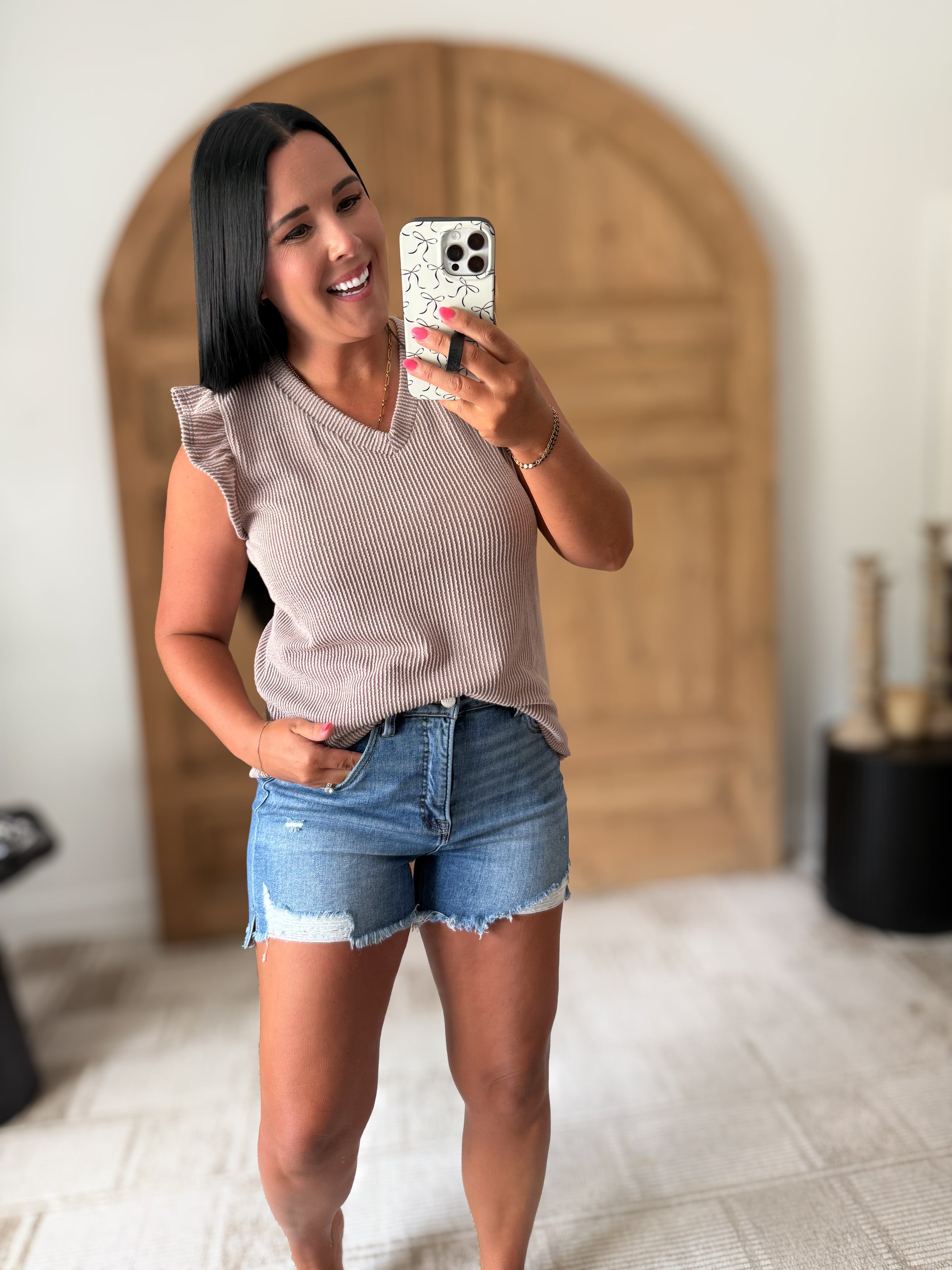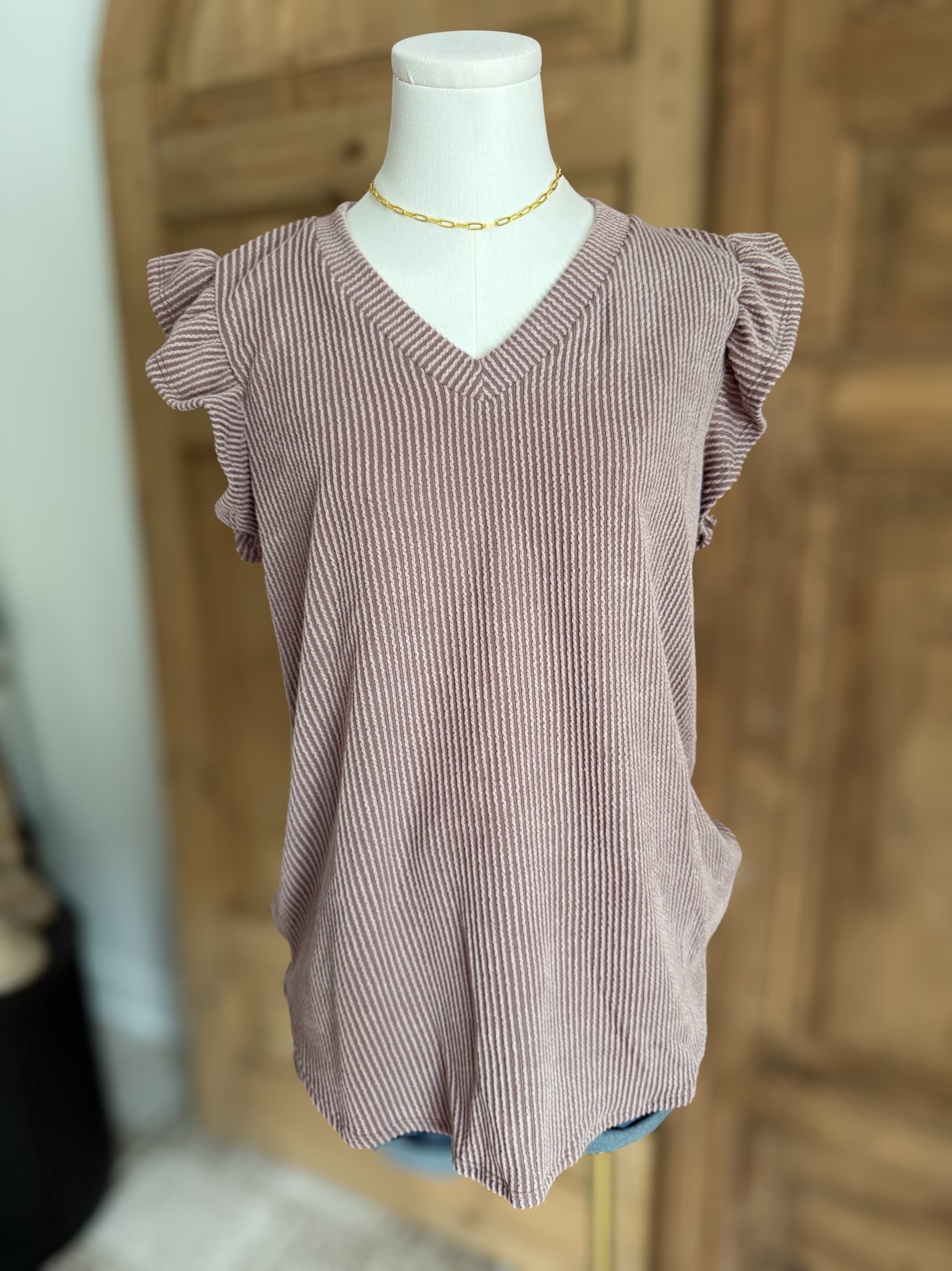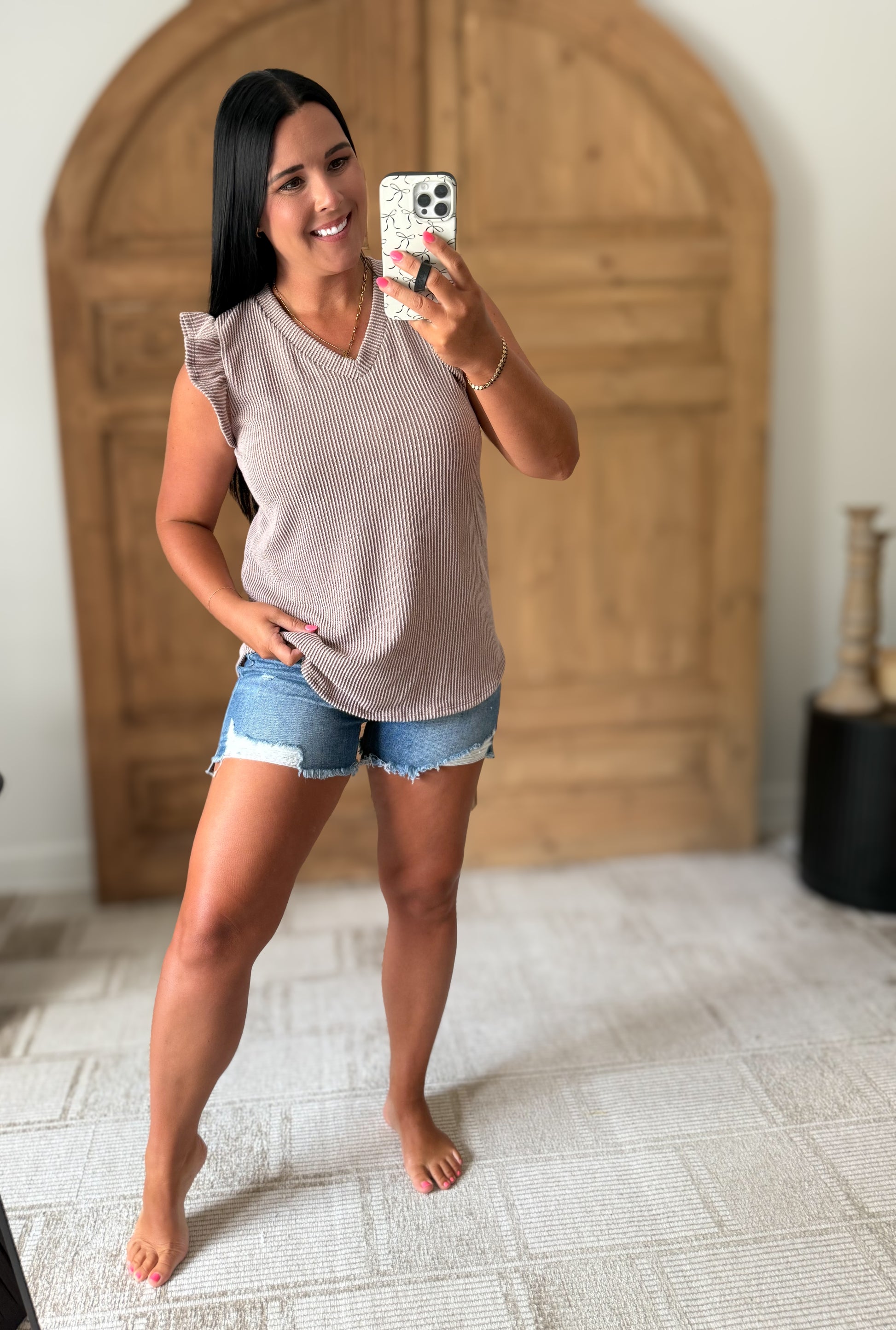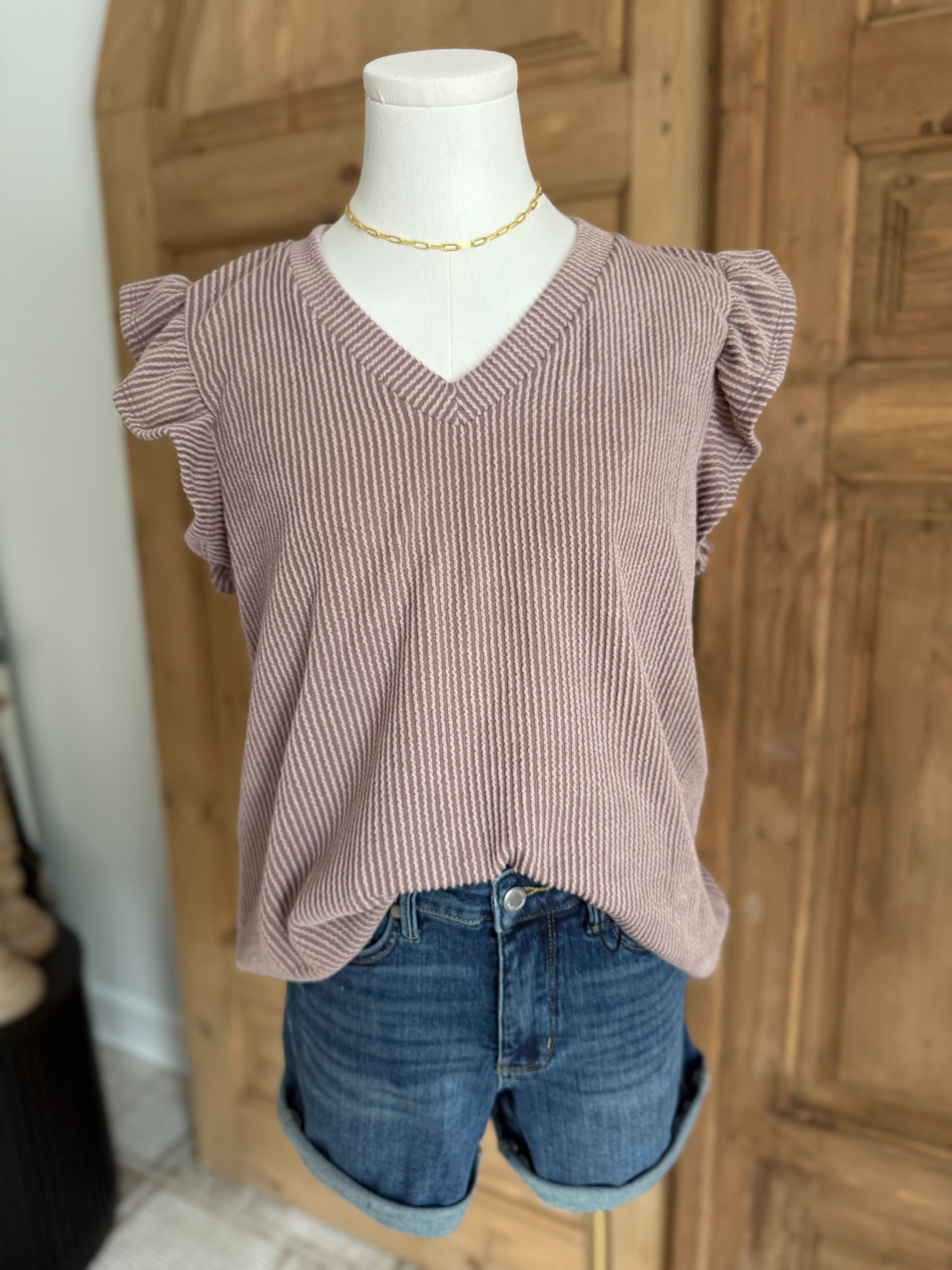 Experience effortless elegance with the Corded Dreams Ruffle Sleeve Top. Crafted from soft, ribbed fabric with a comfortable stretch, this mocha-colored sleeveless top adapts seamlessly from casual to dressy looks. Pair it with shorts, pants, or skirts for versatile style that moves with you throughout your day.