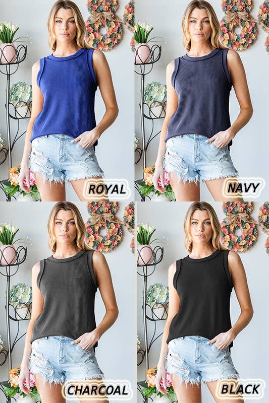 SLEEVELESS WITH BAND ROUND NECK WITH BAND SOLID URBAN RIBBED TOP WITH ROUND HEM AND STITCH DETAIL