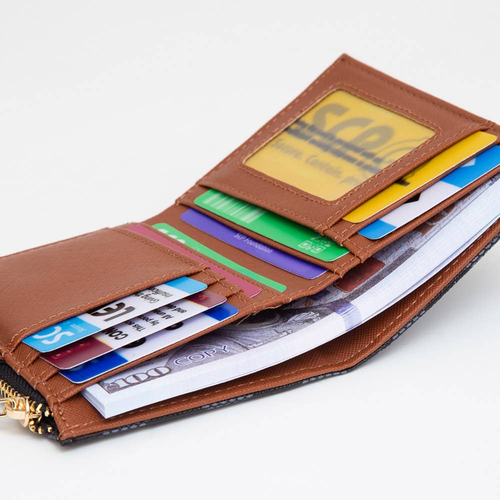 Product Details: • Snap Button Closure • Zipper Closure for Coin Purse • 1 ID Window / 8 Card Slots • Full Length Cash Pocket
