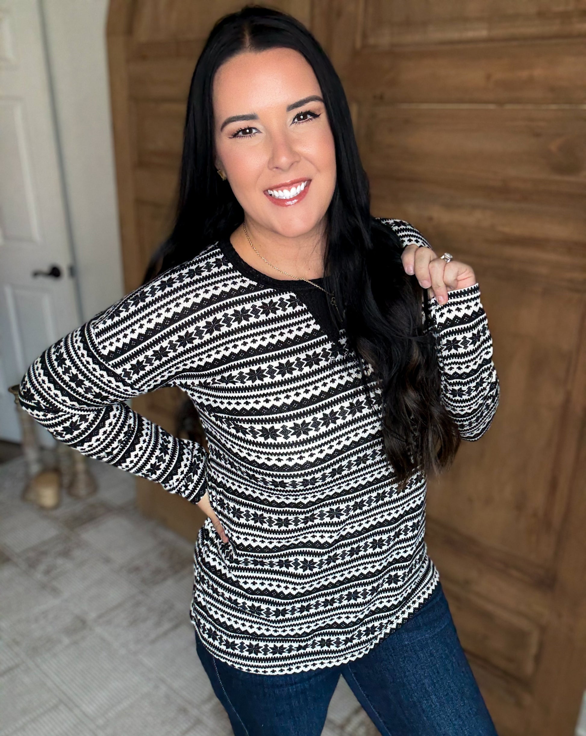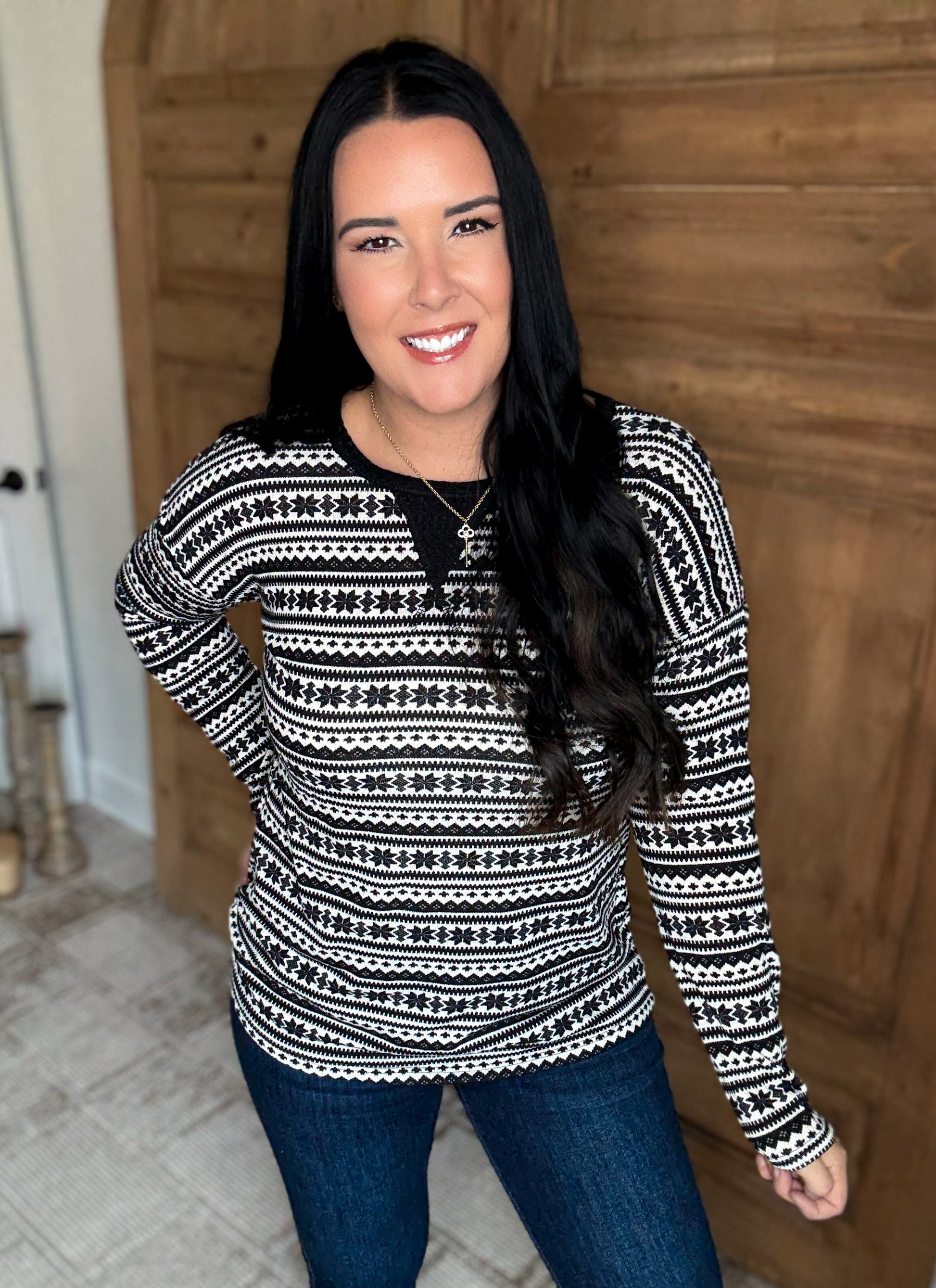 Meet your new go-to winter favorite! This black and white snowflake top is everything you want in an everyday piece—soft, stretchy, and effortlessly comfortable. With a true-to-size loose fit, it gives you that relaxed, easy feel you’ll love all season long. Want a closer fit? Simply size down one for a more tailored look.