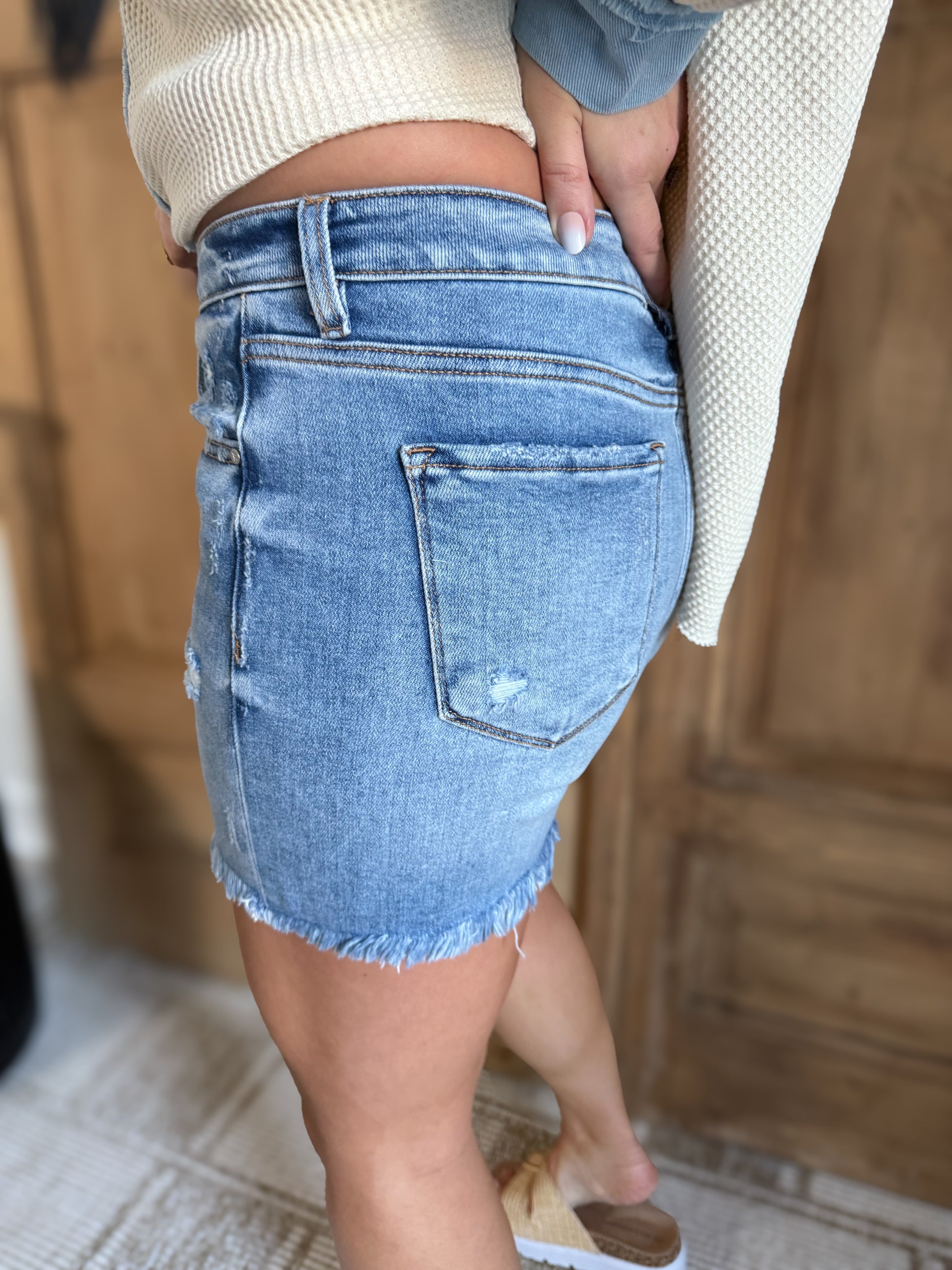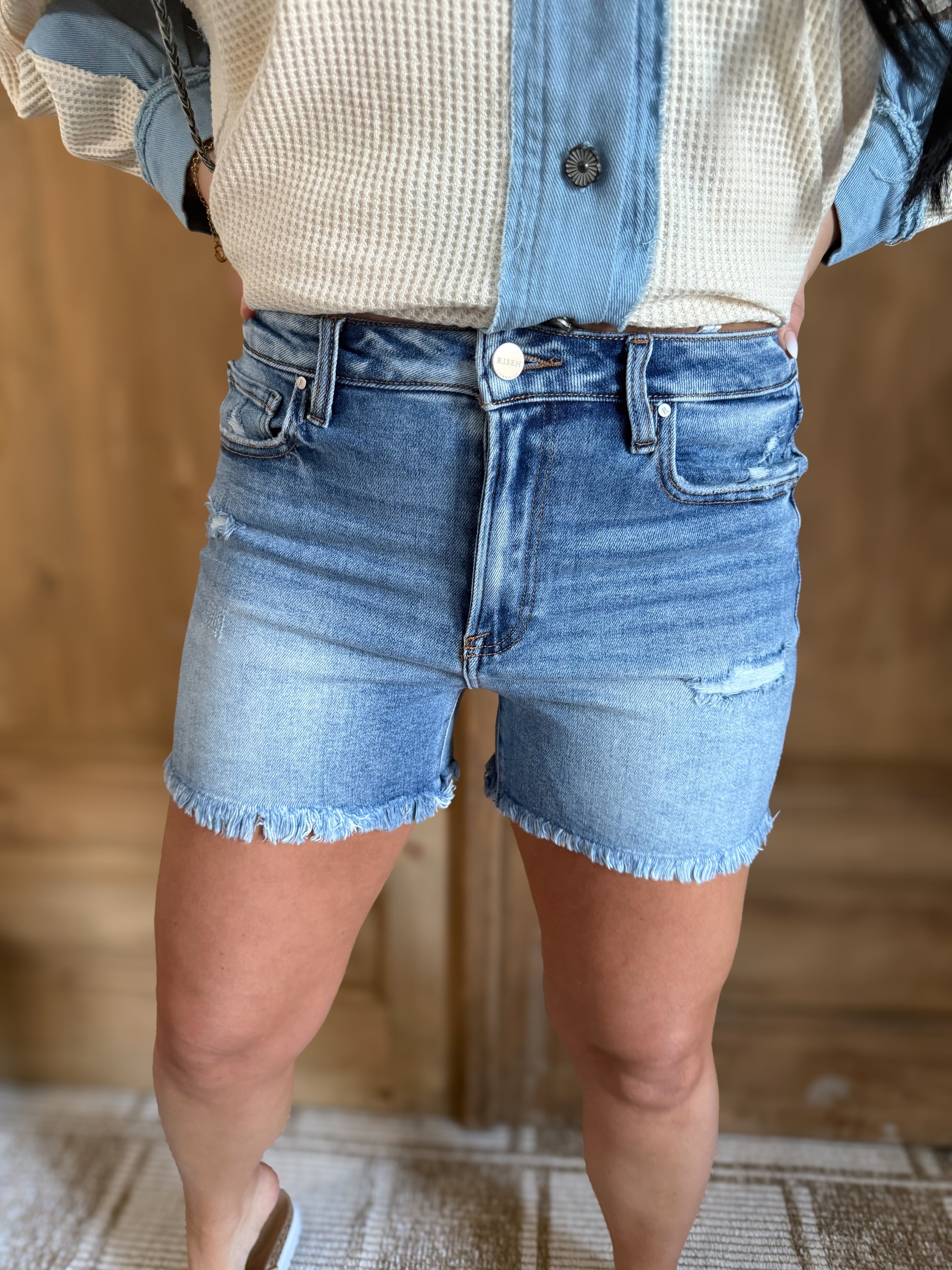 RISEN HIGH RISE SLIGHT DISTRESS SHORTS