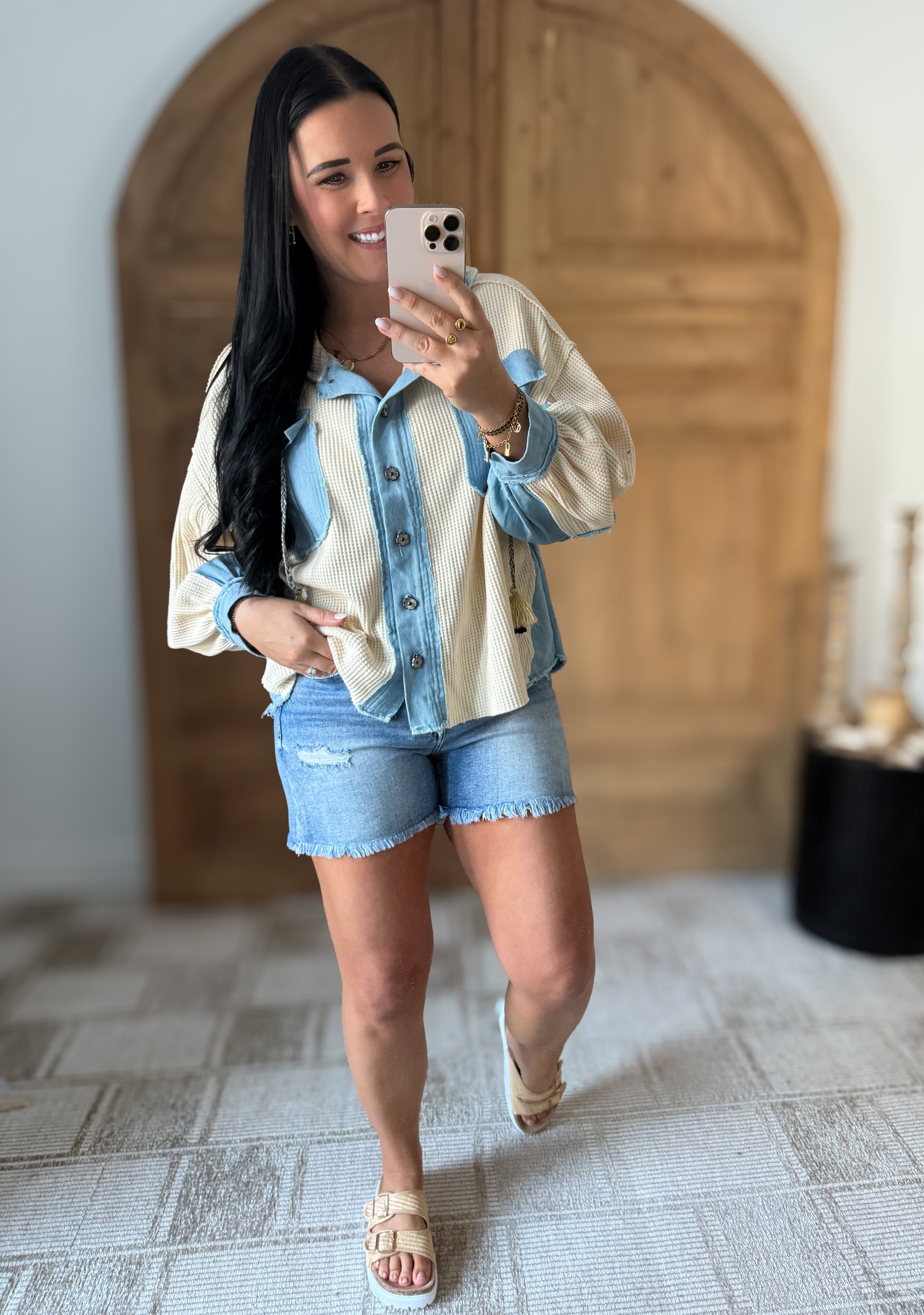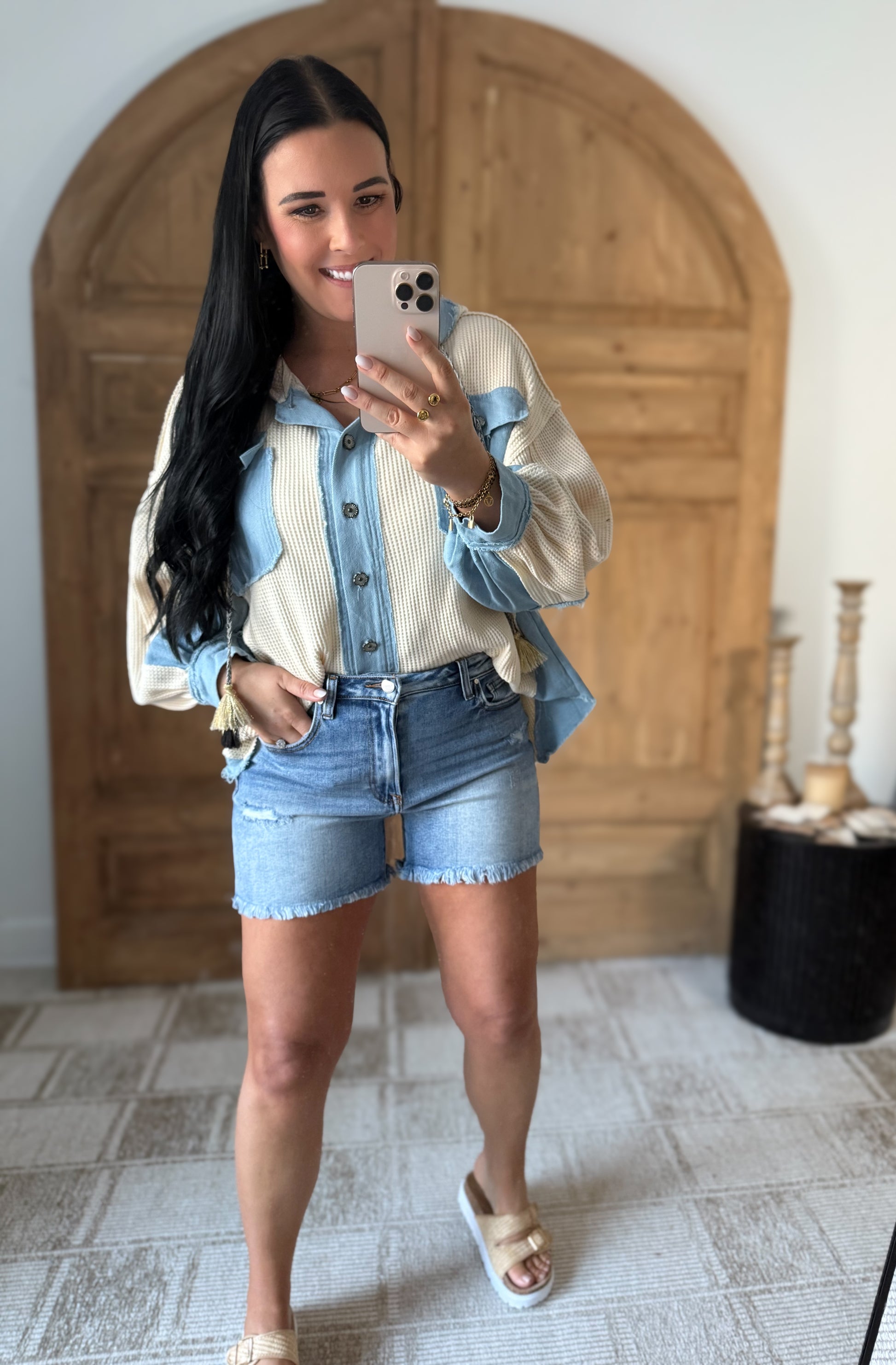 Elevate your summer style with our HIGH RISE SLIGHT DISTRESS SHORTS RISEN! These cute and trendy shorts feature a frayed bottom and slight distress for a laid-back yet stylish look. The high rise design flatters your figure while the light wash adds a touch of charm. Upgrade your wardrobe today!