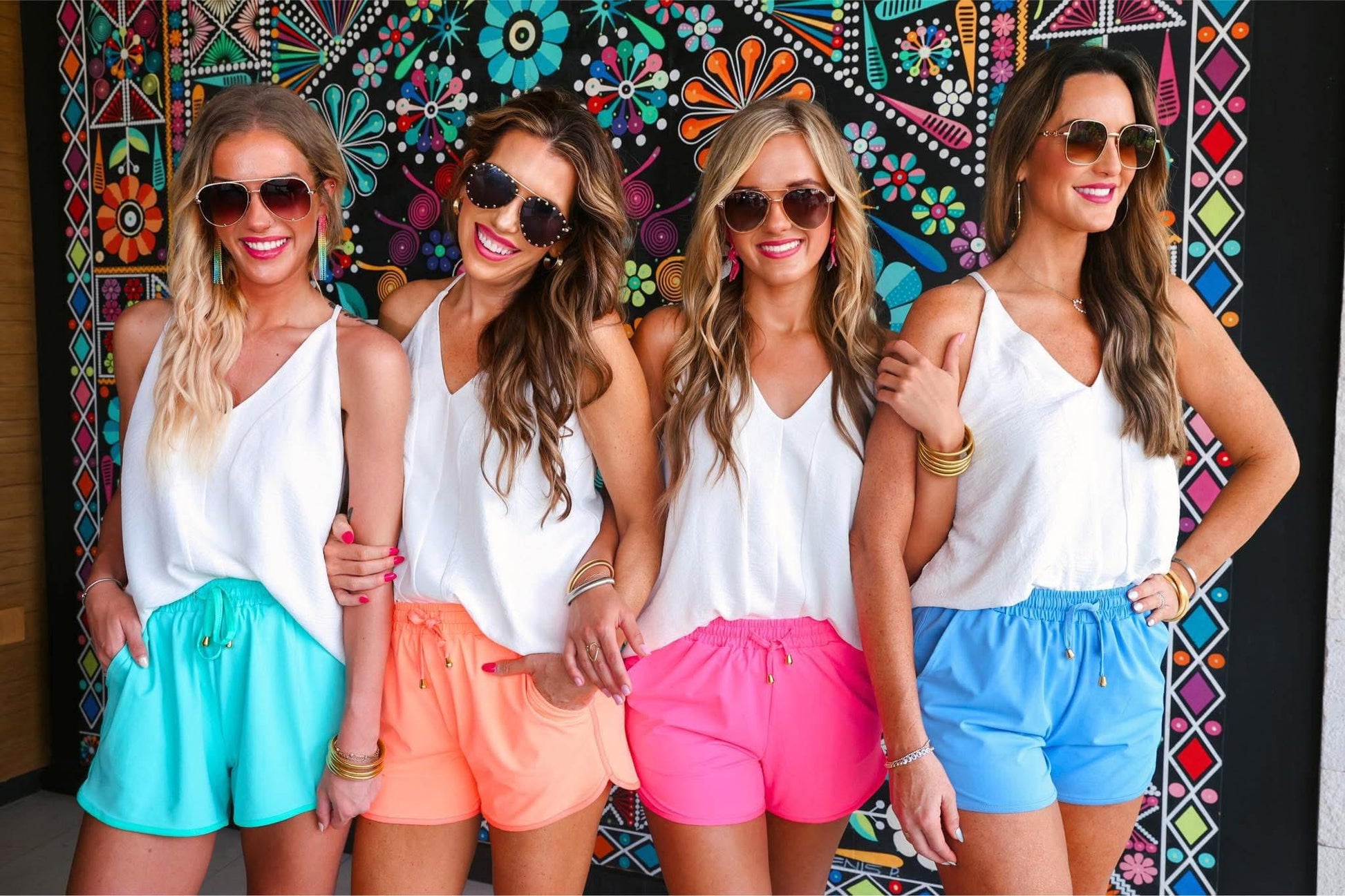These mid-rise solid bright colored shorts are so perfect for the spring and summer and even to wear in to the fall! Get the effortless yet chic look with these shorts. They feature a mid-rise, tie waist drawstring, & side pockets. These are a relaxed fit. These shorts are perfect for pool side lounging or a trip to the beach! They are Moisture wicking & quick drying. They are perfect for pulling over a bathing suit and adding an extra dash of color to your swimsuit!