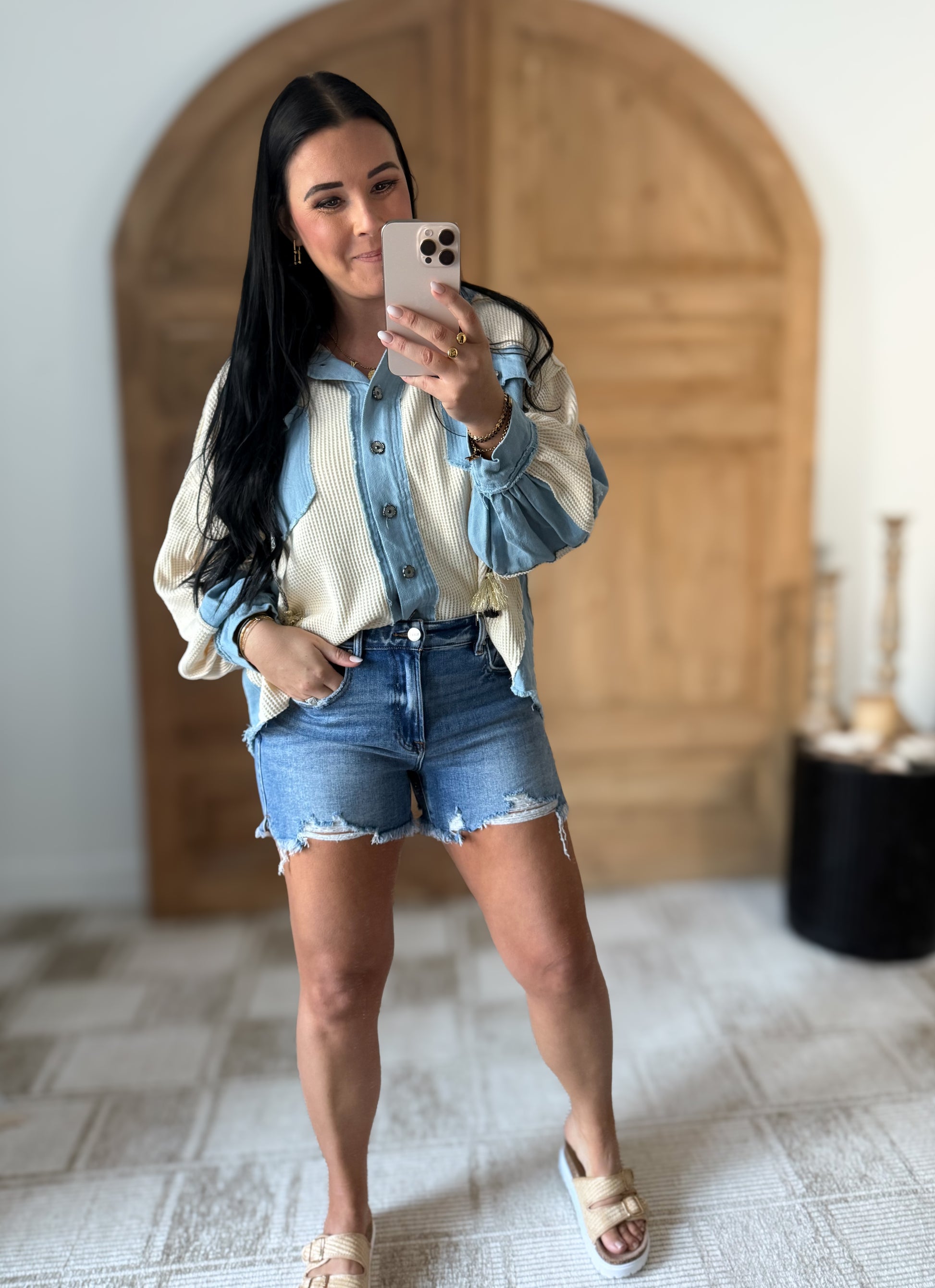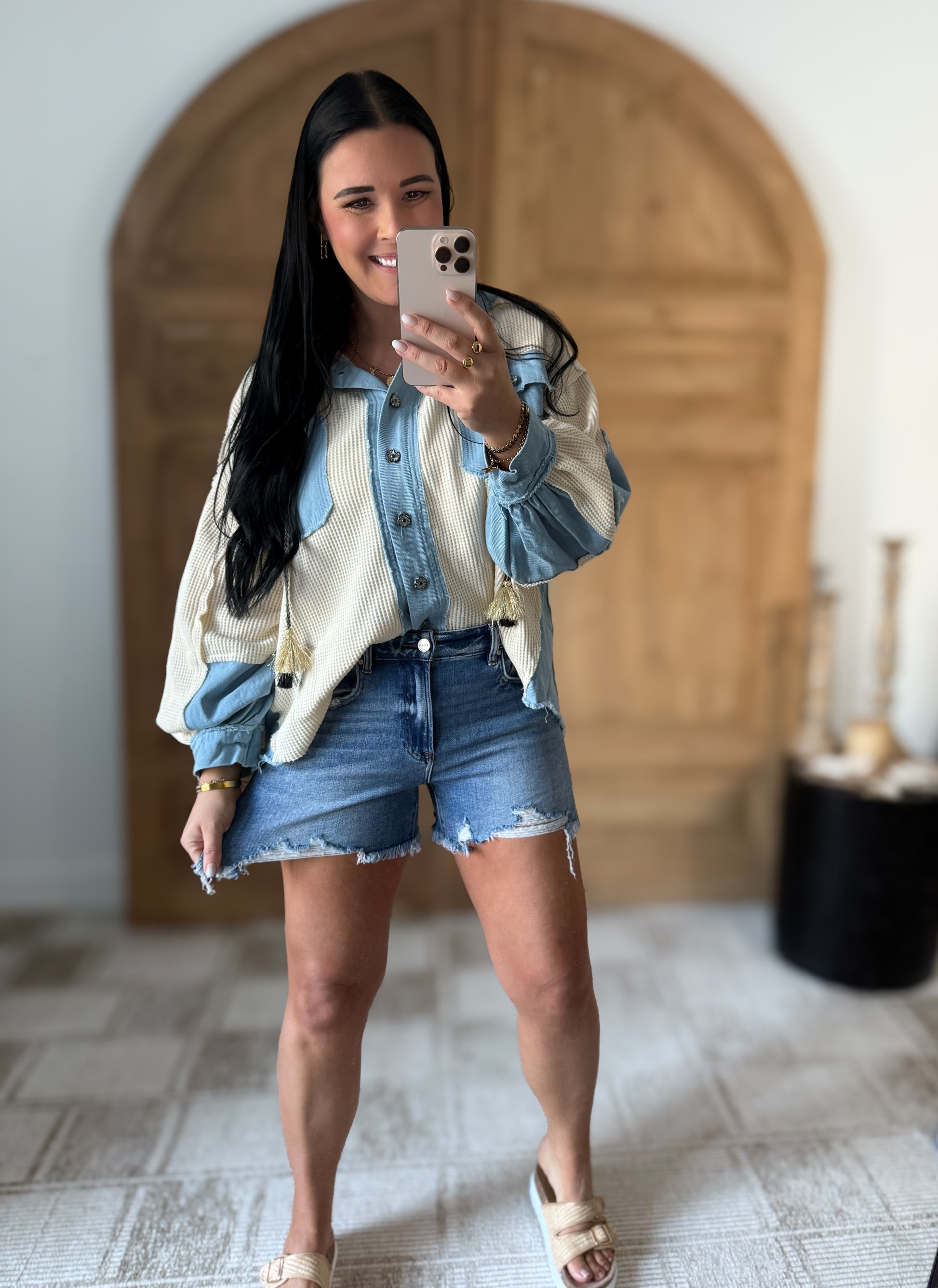 MODEL: Sarah Kay black hair wearing a size medium. She is 5’7.5” tall. Normally a size 5 in Judy Blue and a size 7 in Risen.