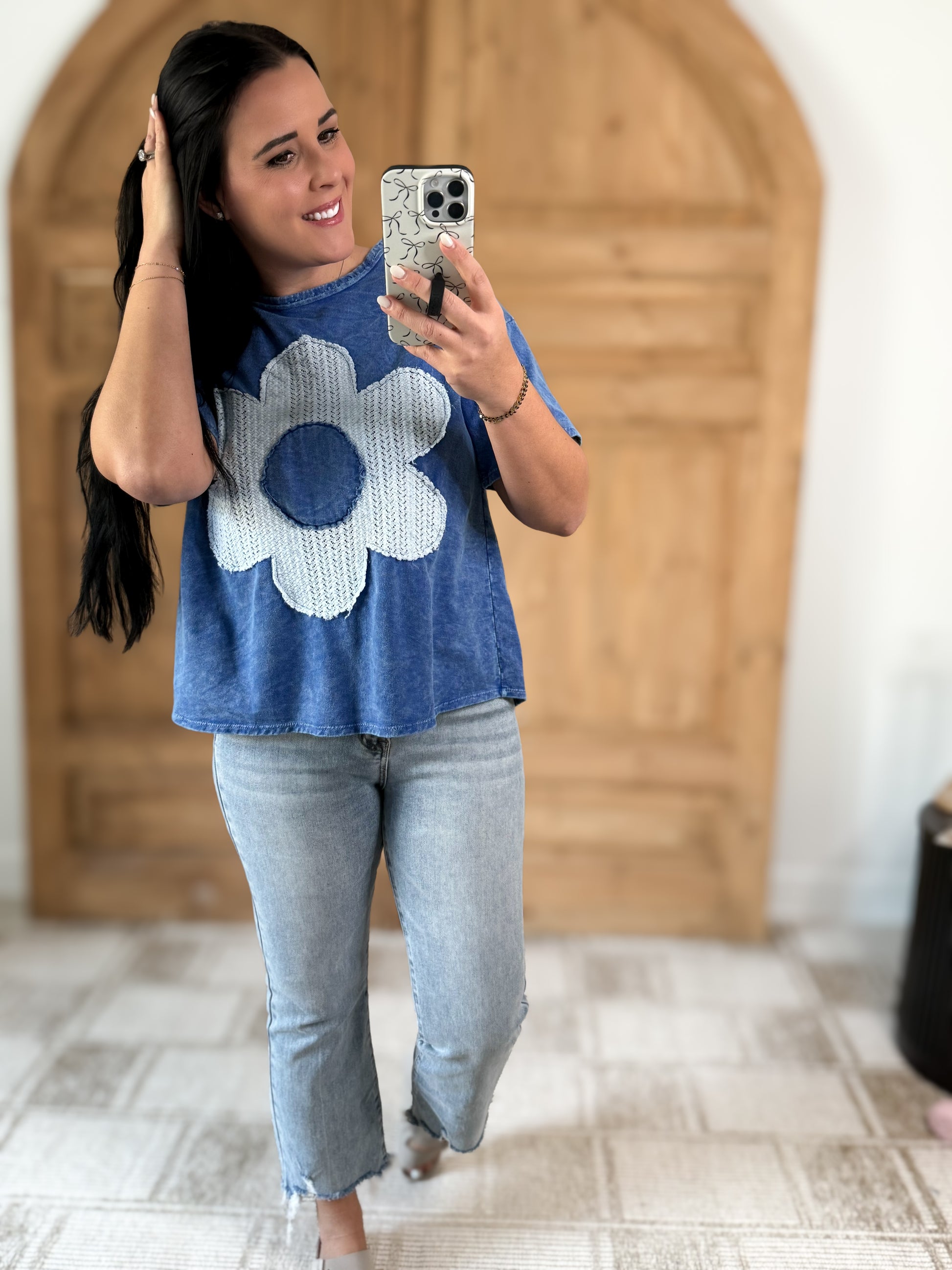 Brighten up your wardrobe with our playful MINERAL WASHED FLOWER PATCH COTTON T-SHIRT in vibrant cobalt. The cute flower patch adds a touch of whimsy to this simple yet colorful top. Perfect for adding a pop of fun to any outfit!