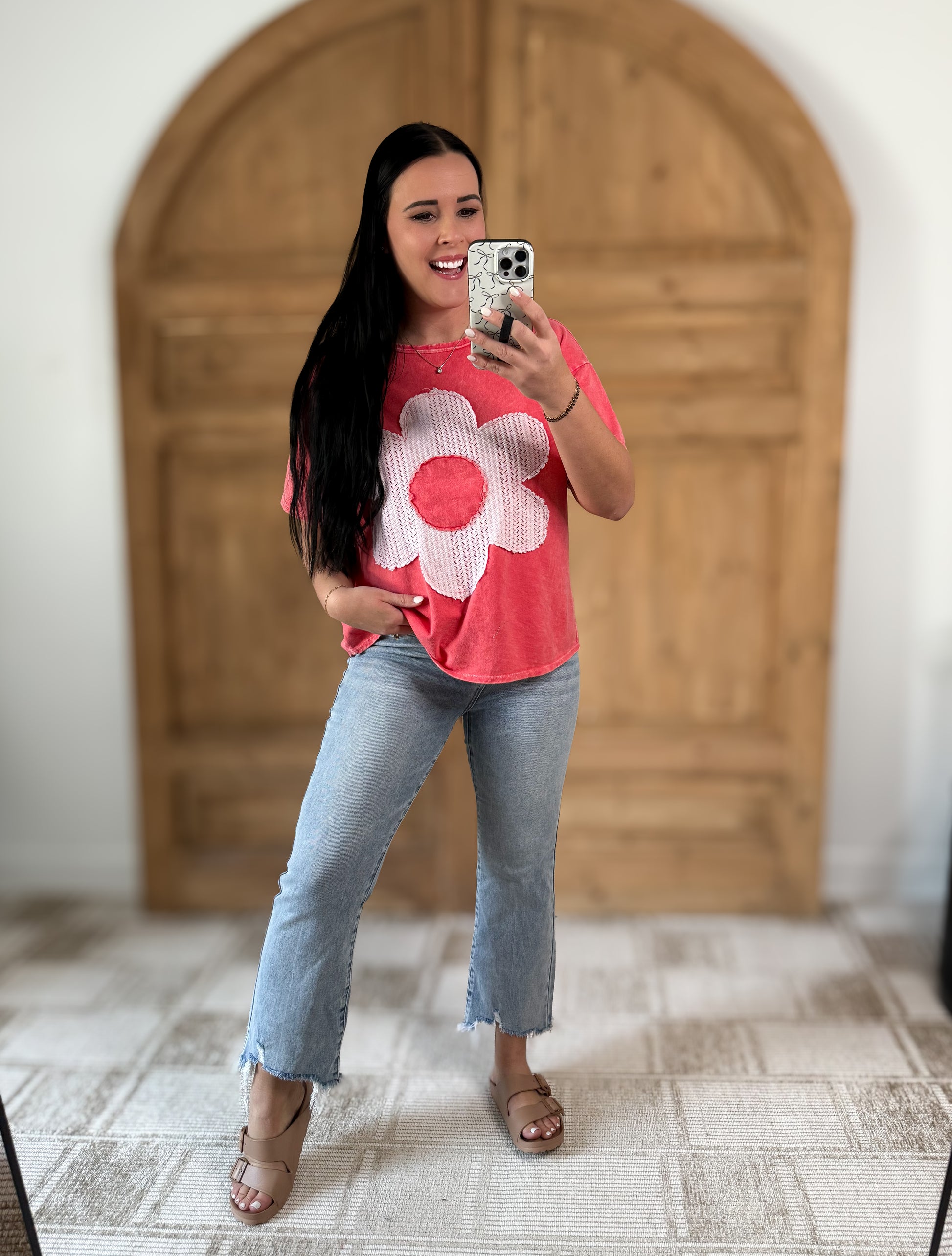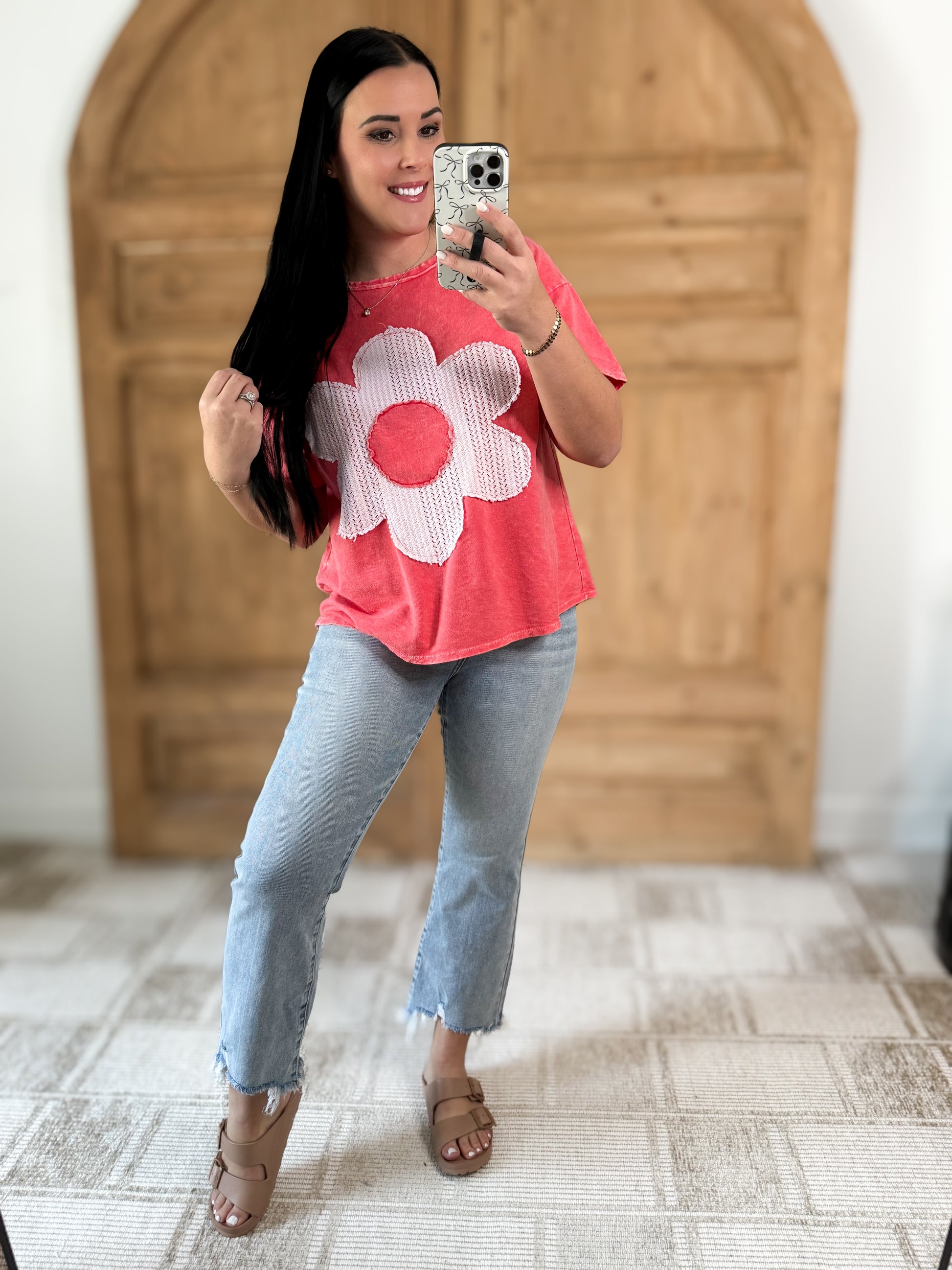 J.HER MINERAL WASHED FLOWER PATCH COTTON T-SHIRT CORAL