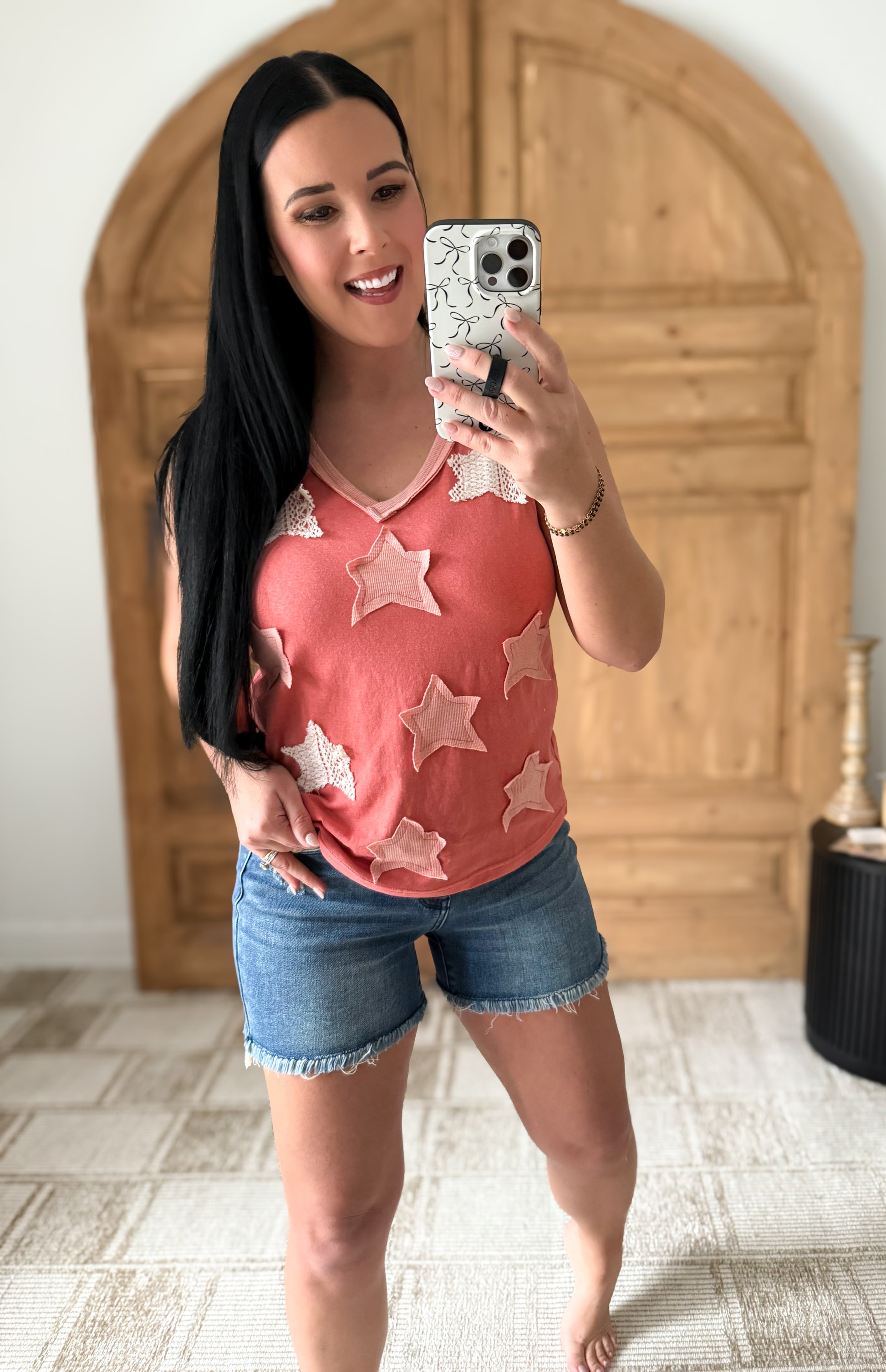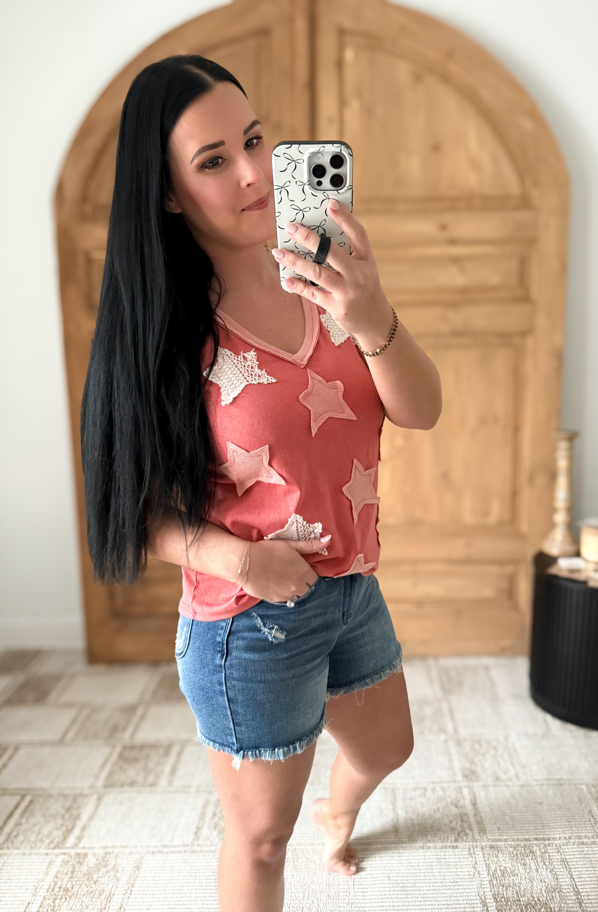 This soft and stretchy tank is perfect for any season. The unique star patch details add a touch of personality to your outfit. Don't miss out on the perfect blend of comfort and style!