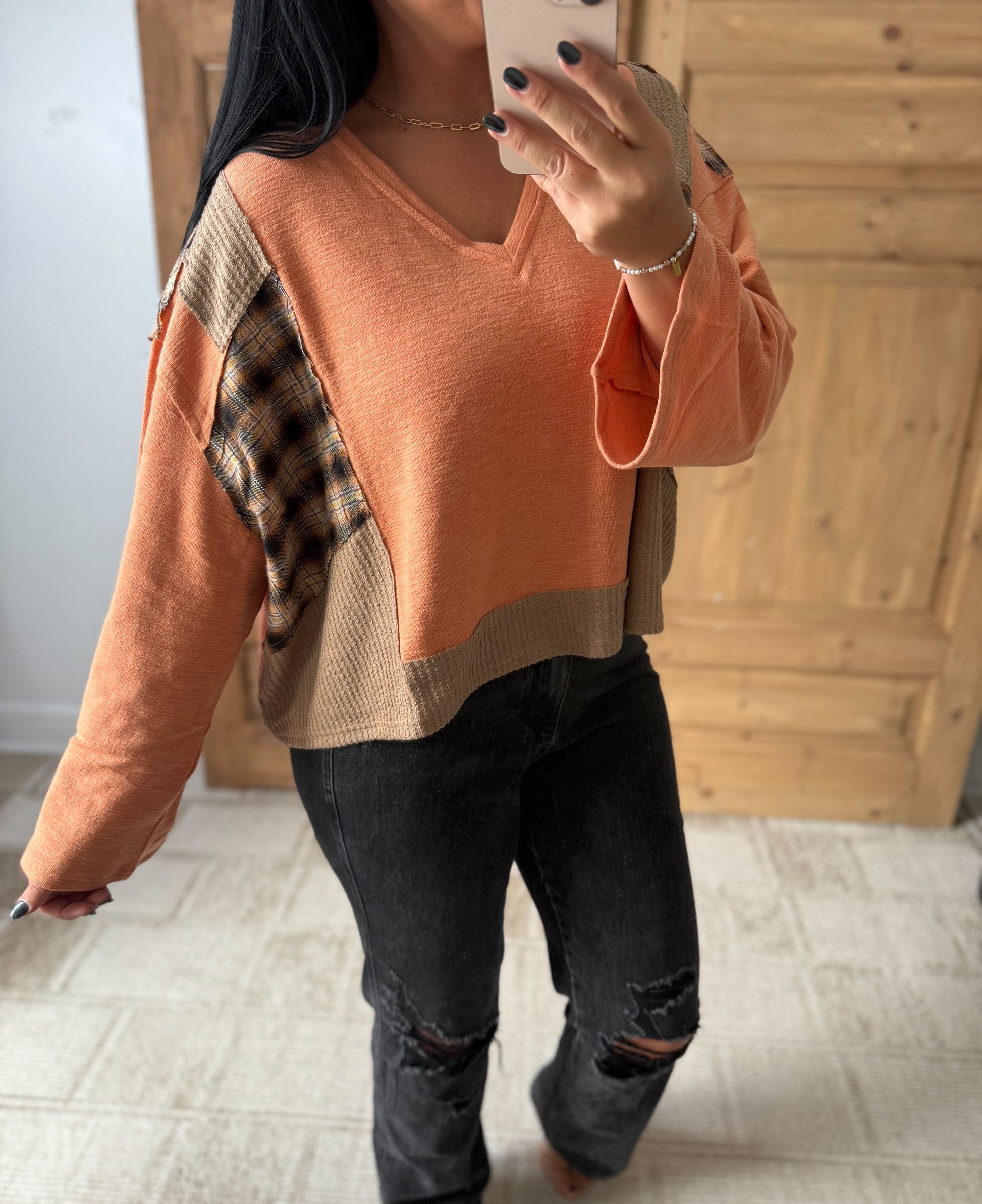Elevate your look with our V-neck long sleeve plaid contrast top featuring texture knit detail. This top combines classic plaid patterns with modern textures for a unique and stylish ensemble. The V-neck adds a touch of elegance, while the texture knit detail adds depth and interest to the design. Perfect for both casual and dressy occasions, this top offers versatility and sophistication. Stand out in style and showcase your fashion-forward sense with this chic and trendy piece.
