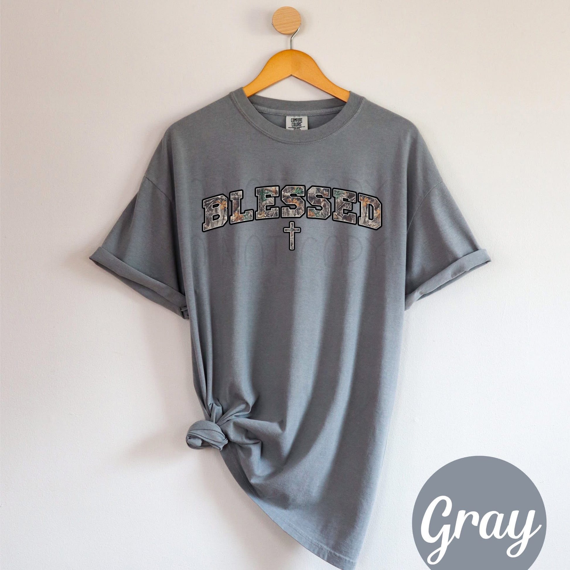 Get ready for a beautiful and stylish addition to your wardrobe with our PRE ORDER BLESSED CAMO COMFORT COLOR TEE.